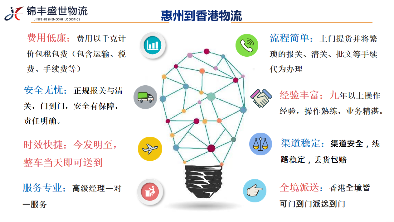 深圳市錦豐盛世物流有限公司致力于打造國內高效、快捷、安全的香港物流服務(wù)專(zhuān)線(xiàn)。主打惠州到香港物流專(zhuān)線(xiàn),惠州到香港整車(chē)及零擔運輸,惠州到香港快件運輸,惠州到香港一般貿易出口運輸,代理報關(guān),商檢,清關(guān)及香港全境派送服務(wù)。